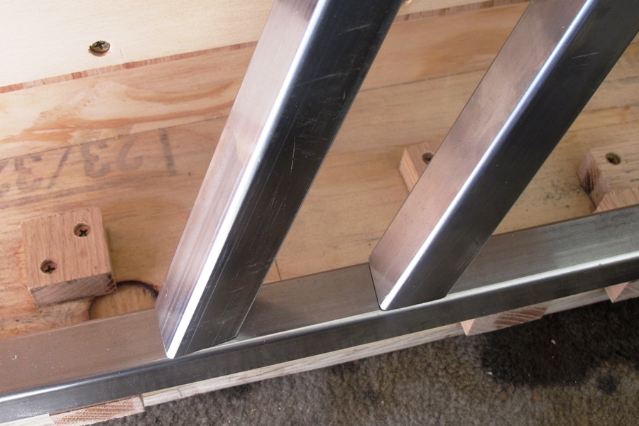 The end of our freshly-filed side tube didn’t seem to fit squarely on the bottom tube. It was perfectly flush, but when we positioned it with the forward face perpendicular to the frame, the side of the tube wasn’t lined up with the frame lengthwise. That didn’t make sense. Stand a square tube on a flat surface and the section it makes on the surface is a square. Lean the tube backwards and the section will elongate into a rectangle. Then lean it to the side, and the rectangle should once again elongate to that side and start to become square again.