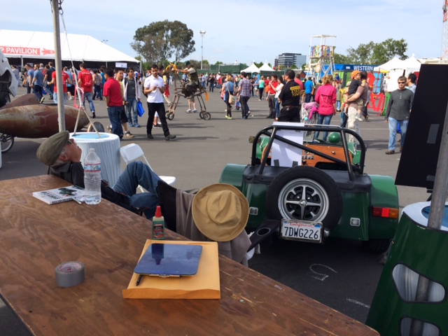 Another one of our many trips in the Locost was a drive down to the Bay Area Maker Faire in May. Long time readers may recall that we attended this event as spectators last year, when our car was still in the rolling chassis stage and unlikely to ever be completed. This year our Locost was proudly on display, and except for a slightly dented bonnet that we removed for most of the show, was looking mighty complete. During the two-day event, thousands of visitors wandered by to look at the car, or possibly one of the other cars parked nearby.