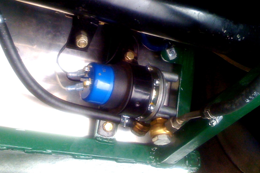 We had to chase the threads with a 5/16"-24 tap to scrape away the old bolt thread residue, but when we installed the pump, the threads in the block provided enough grip to allow the new bolts to be torqued to the requisite 15 ft.-lbs., and possibly beyond, although in an effort to secure at least a modicum of common sense we didn't actually test this out. Against our better judgment we did apply a tiny amount of RTV to the new gasket, and we're pleased that the new pump hasn't yet sprung a leak, although the guy who has to remove it 40 years from now will not be happy about it. The fuel pump was a different story. The 40-year old pump valves that we didn't replace two years ago when we had the chance had been working overtime to coax fuel in the direction of the carburetors. The resulting rapid firing of the solenoid soon fried the contacts, and as a consequence the pump would operate for only a minute or two before dying, and had to be jarred back to life by the standard method of a sharp rap on the pump body. Unfortunately, most of our drives last more than a minute or two, and stopping every mile or so to climb out of the car and bang on the pump seemed to be adversely affecting our average speeds.