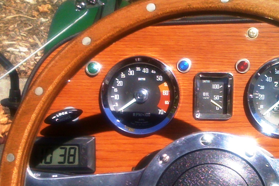 The new tachometer seems to work about as well as the old one, which wasn't all that good but at least it doesn't bounce around like the speedometer. The new tach is much brighter at night, which may have something to do with the aforementioned cleaning, but that's only a theory, and not nearly enough to motivate us to pull the speedometer apart. By far the best news about the new tach is that we can see it much better than the old one. This has nothing to do with the device itself, and everything to do with the latest and undeniably final version of our M.G. Locost steering wheel.