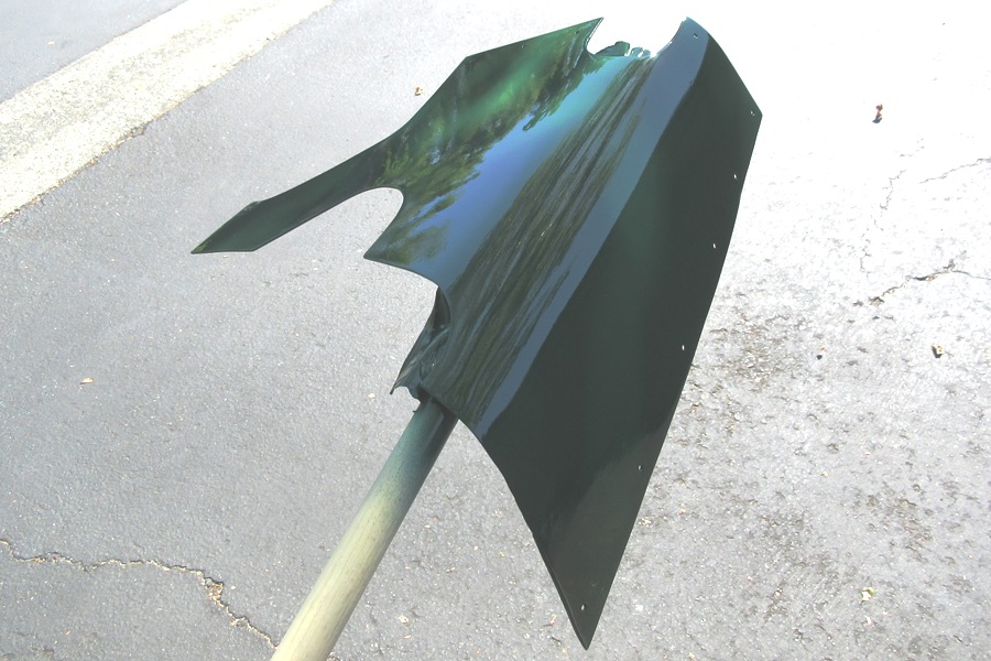 The forward body panel that got mangled when the frame was crushed is ready to go back on the car. We had to strip the old rattle-can green paint off the panel, all the way down to the metal, then cover it with about six coats of high-build primer, but we finally got the surface smooth enough for a single layer of Rustoleum Hunter Green. The new paint is uncomfortably thin, barely enough to hide the primer, but we're done with the panel because the paint won't dry for weeks, or ever, and would shrivel like a grape at the slightest hint of any more paint. The rest of the accident damage seems to be fixed. While under the car replacing rod ends, we found the spot where the floor had engaged the median strip. It's about 6" from the transmission tunnel, right in front of our Aussie floor stiffener, totally justifying our uber-heavy Aussie mods. The floor was pushed up about 1/4 inch, not noticeable from the driver's compartment because of our plush carpets and floor mats, but easily flattened with a long 2x4, a.k.a. wooden beam, and a BFH, a.k.a. hammer. As a bonus, the floor no longer oil cans when we step in the car. |