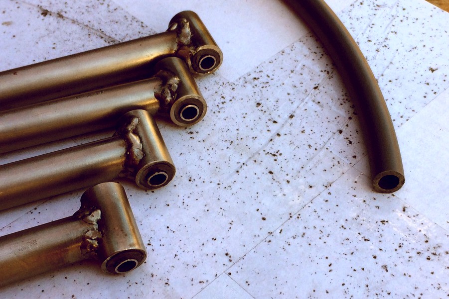 February 26, 2017 We'd almost forgotten how much fun it was to build the suspension on our Locost. Fortunately, replicating the project in half-scale has served as the perfect reminder, and while prior experience has kept us from repeating many of our early mistakes, even the tasks that went well were hard. Tapping the upper control arms for 3/8" Heim joints, for example, an hour each. And cutting and shaping 21 pickup brackets. Just like on the big Locost, making even one of these takes an inordinate amount of time, far more than it's likely worth.