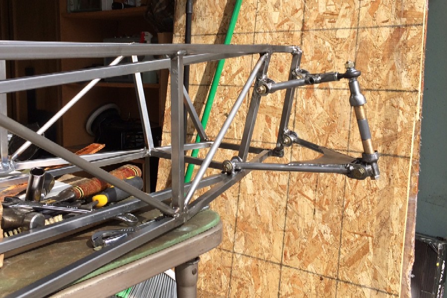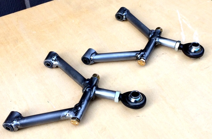 One thing that surprised us during construction of the suspension was the relative simplicity of the upper control arms. With only five short tubes for each, they seemed to go together a lot faster than the control arms on the big Locost. It helped that we only had to build one jig, instead of the three we needed to get the full-scale control arms right, and it also helped that we welded them up ourselves, instead of dragging them off to be TIG welded in a foreign city. We didn't expect to complete the upper control arms anytime soon, or at all, ergo our surprise. The upper control arms are pretty much a match for the upper control arms on the big Locost, except only one tube is needed to attach the outboard end to the spindle, which means the little control arms are not split in two pieces like their big cousins, and therefore don't need to be bolted together. Which of course didn't stop us from bolting them together, or at least simulating bolting them together. The bolts look great, even though they're not actually doing anything, other than adding weight, which as we already noted is not really an issue.