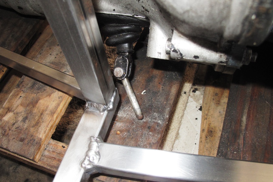 So the engine and transmission are installed in the frame, and clearances are definitely tight all around, but certainly adequate. No less than half an inch anywhere, but not much more than an inch anywhere, either. Our only real doubts were in the area of the clutch slave cylinder, which we never actually installed in the mock-up frame, but we did estimate the clearance as best we could, and then added an inch to our estimate just for luck. It turns out that our actual clearance now is three-quarters of an inch, which is why we added the inch, luck not being our strong suit.