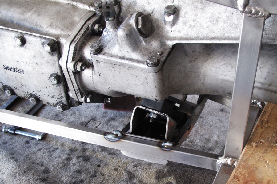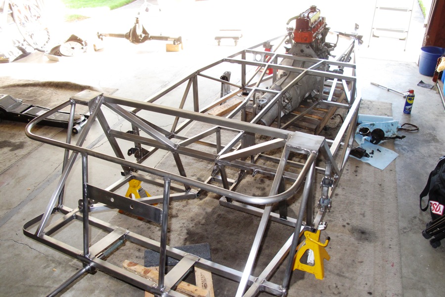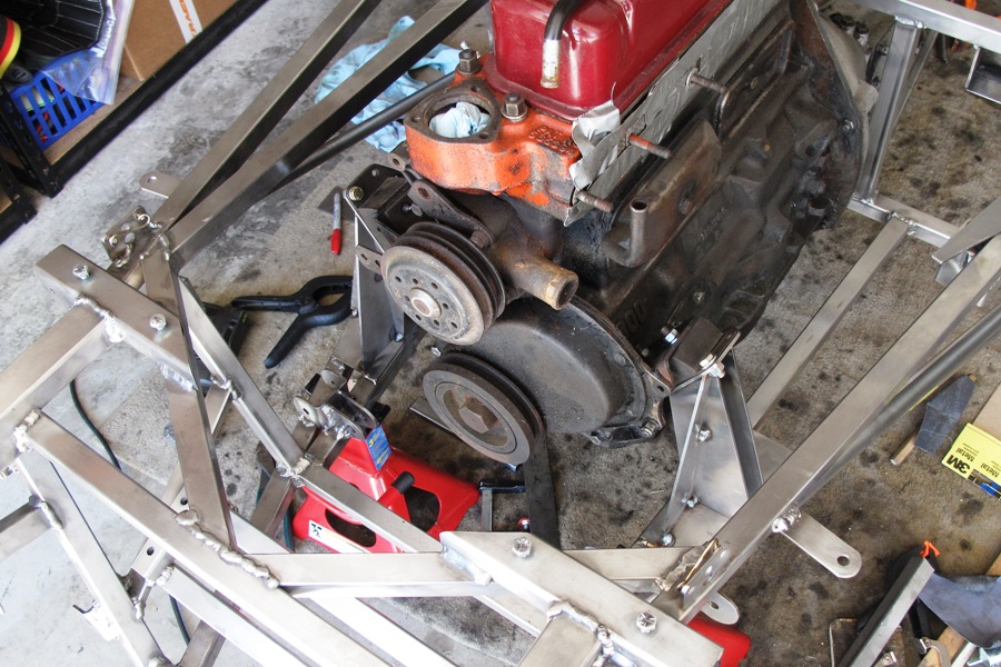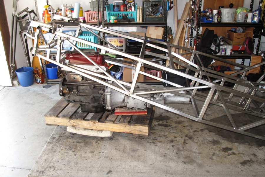 September 4, 2012 Yes, the rumors are true. Another miracle has occurred. As we imagined for the past year, but never quite believed possible, the MGB engine and transmission are mounted in our steel Locost space frame chassis. The part we never really believed possible is that you could somehow slip the frame over the engine and transmission, and thereby eliminate the whole cherry-picker engine installation process. But it actually worked.