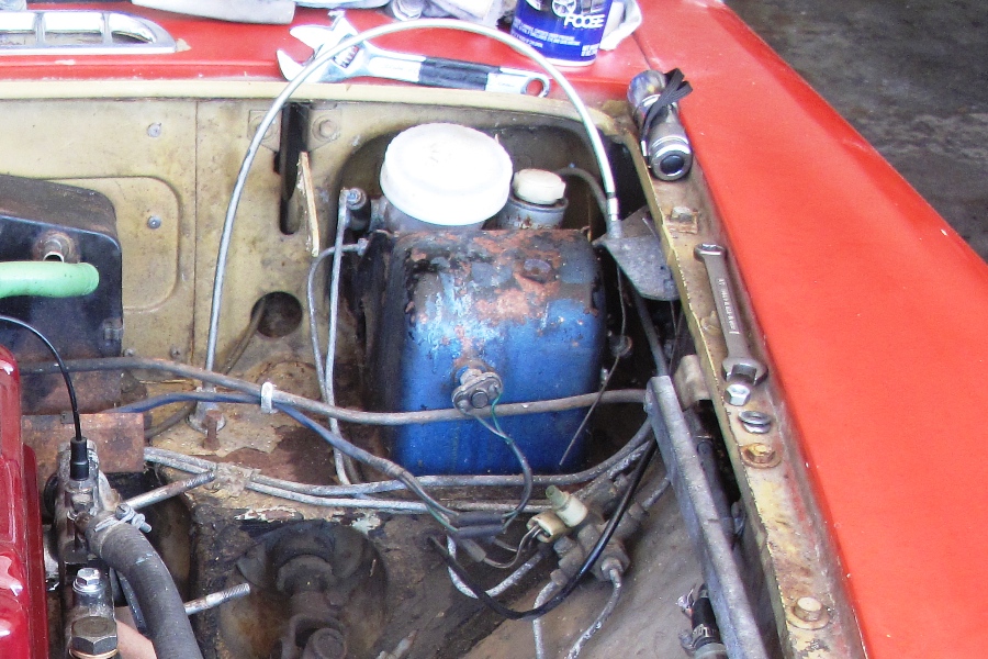 So we put up with the leak, and the brakes would almost always work, except when the fluid reservoir would drain completely out. We didn't notice this happening so much in the old days, before the engine rebuild, because back then we had to check the oil every five minutes, and that tended to provide us with the opportunity to keep the brake reservoir topped up. Unfortunately, once we rebuilt the engine, our oil consumption dropped to zero and the reservoir would empty itself fairly often, like for example any time we went a couple of weeks without popping the bonnet. Losing the brakes was generally a manageable affair, but the mess left behind by the leak was not. Paint on the pedal box, firewall, and engine bay shelf all wrinkled like a prune and peeled like a grape. This was easy enough to hide with a tightly latched bonnet, but the fluid would also seep out onto the driver's side bodywork, making a mess there. Over the years, when it got really bad, we'd clean it up and repaint it with a brush, a fix that would last at best a week.