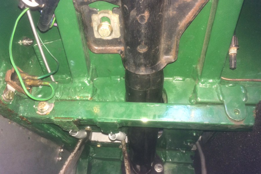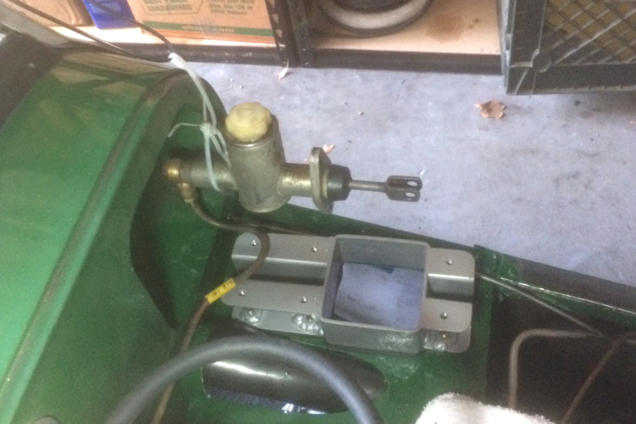 When we finally got those last two invisible bolts out, it was like a miracle had occurred. We couldn't believe it. After five long years in captivity, buried deep in the engine bay and slowly dissolving under a cascade of wanton brake fluid, the pedal box was finally free. We never thought we'd see the day. Our grandchildren, maybe, but not us. With the pedal box out, we figured we could easily remove the leaky master cylinder from the pedal box, bolt in the new one from Moss Motors, and then screw everything back together in a single afternoon. Except we couldn't. Because even worse than the mottled paint on the crusty pedal box was the wrinkled mess on the pedal platform and firewall. It was a disaster. The paint peeled off in sheets, a slimy, slippery film of brake fluid clinging to the metal underneath. So we got out a bucket of soap and hot water, scrubbed the entire engine bay clean, peeled off the last of the ruined paint, and then sanded everything down. We spray painted all of the loose pieces in their original colors, and brushed on Rustoleum Hunter Green all over the engine bay.